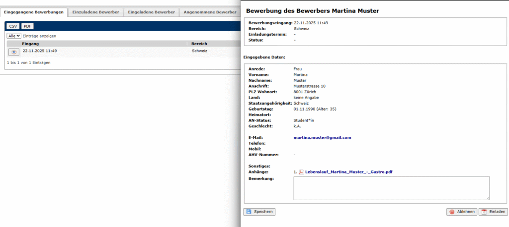 Mit Hilfe des Bewerbertools kann ein Grossteil des Bewerbungs- und Anstellungsprozesses direkt mit GastroPlanNet verwaltet werden. Bewerber werden in einer übersichtlichen Weise dargestellt und können entweder abgewiesen oder mit nur wenigen Mausklicks zum Vorstellungsgespräch eingeladen und als neuer Mitarbeiter im System angelegt werden.