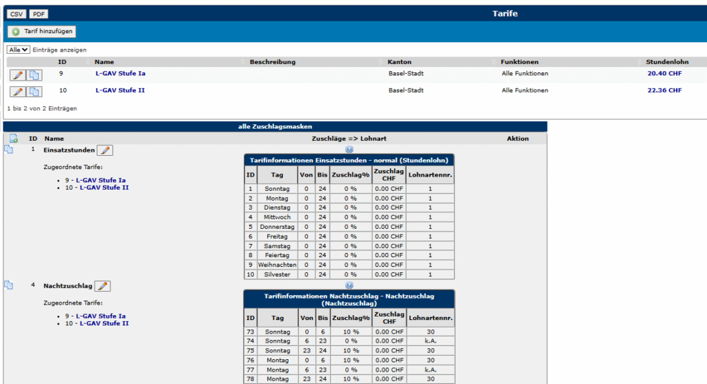 In unserem System können Sie ganz einfach die Grundlöhne, Tarife und Nacht- / Sonntagszuschläge gemäss den jeweiligen gesetzlichen Vorgaben (z.B. L-GAV Schweiz) erfassen, die anschliessend vom System automatisch bei der Berechnung der Bruttolöhne und zur Weiterverrechnung an den Kunden berücksichtigt werden.